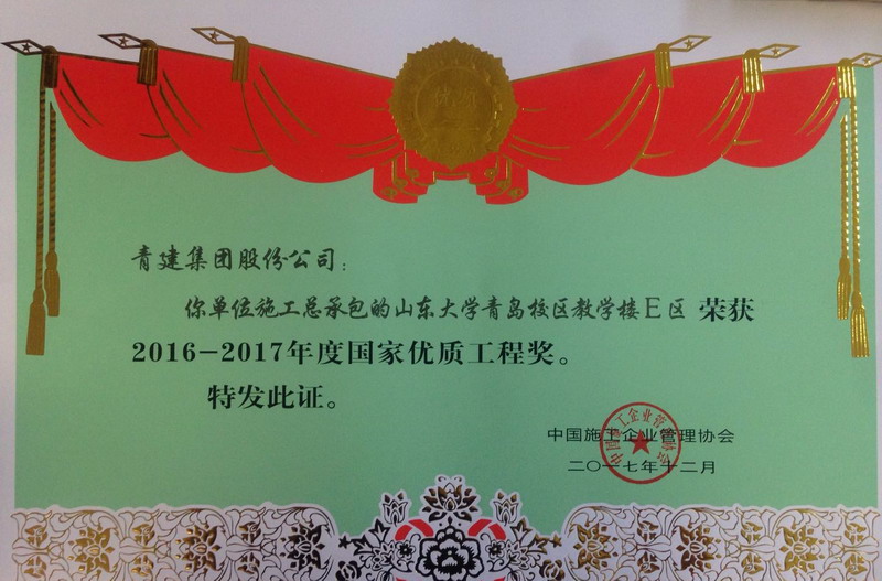On December 13, 2017, the Summary and Commendation Conference of the National Quality Project Awards was held in the Great Hall of the People in Beijing. 2016-2017 National Quality Project Awards were awarded on the conference. In 2017, two projects mainly constructed by Qingjian Construction: Phase I new construction project of Qingdao Fine Arts School and district-E teaching building in Qingdao Campus of Shandong University, as well as the project of inpatient building of the People’s Hospital in Haiyang City involved won the National Quality Project Awards. By the end of 2017, the Group has accumulatively won 14 National Quality Project Awards.
